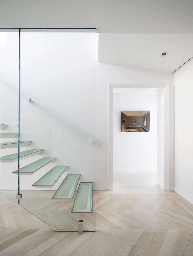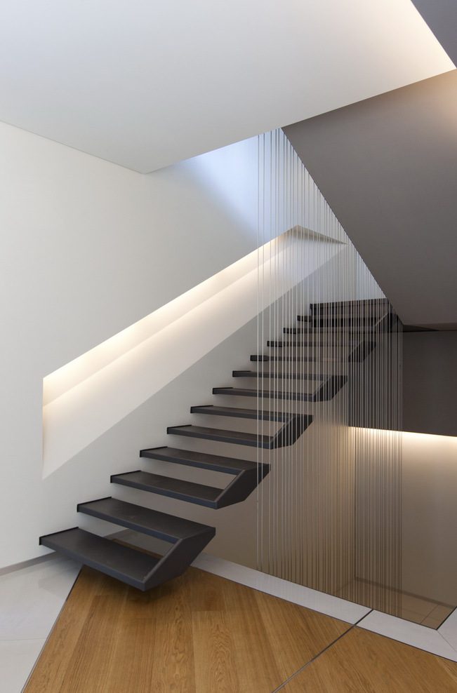Cuando desee conservar una vista intacta o traer más luz a un pasillo de escaleras estrecho y oscuro, puede ser una buena estrategia optar por escaleras transparentes. Pueden estar hechos de vidrio o de algún otro material que deje pasar la luz a través de los hilos. {Encontrado en Burnazzi Feltrin Architects }.