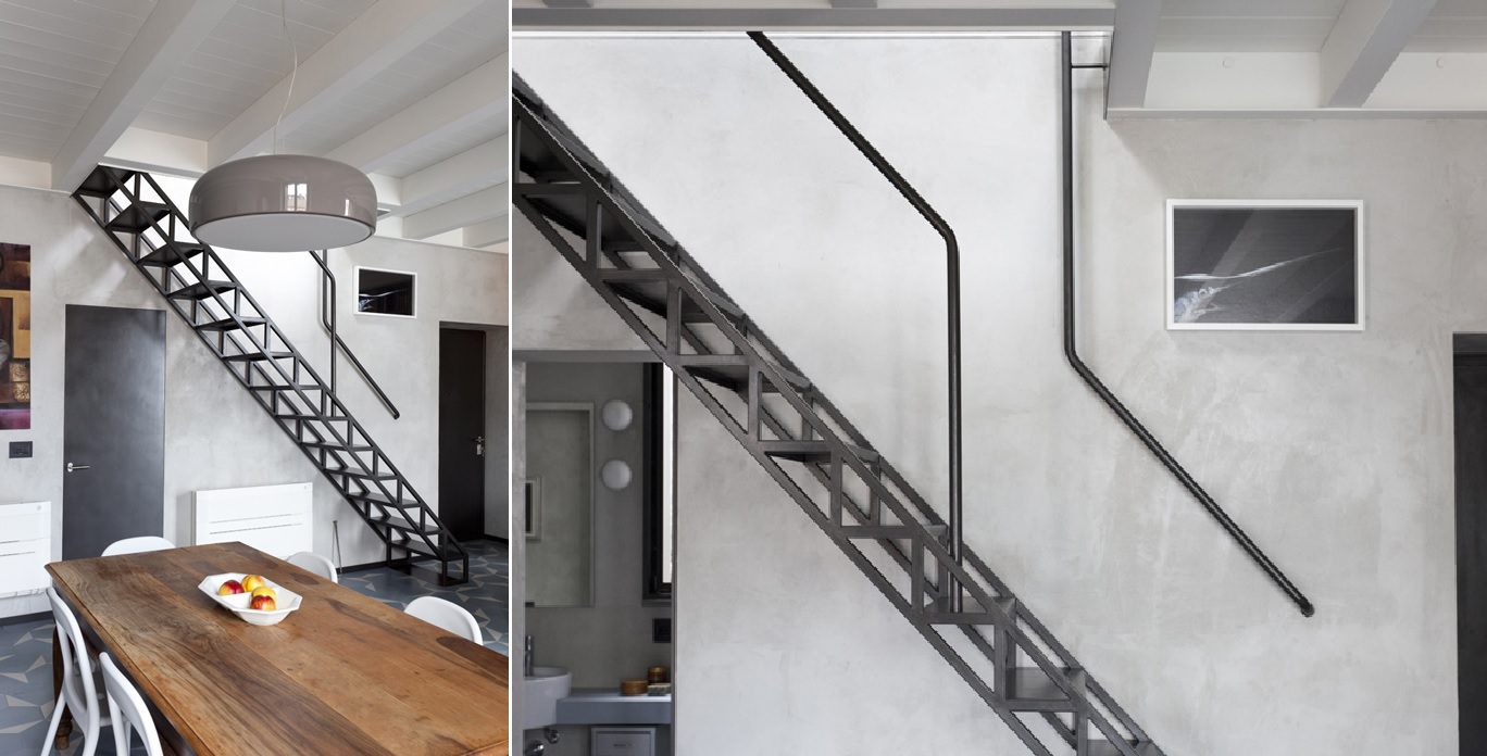 Para atenuar el aspecto fresco y áspero del marco de metal, puede optar por peldaños de escalera de madera. La combinación es bastante común en interiores industriales. La madera recuperada encajaría perfectamente. {Encontrado en Giles Pike Architects }.