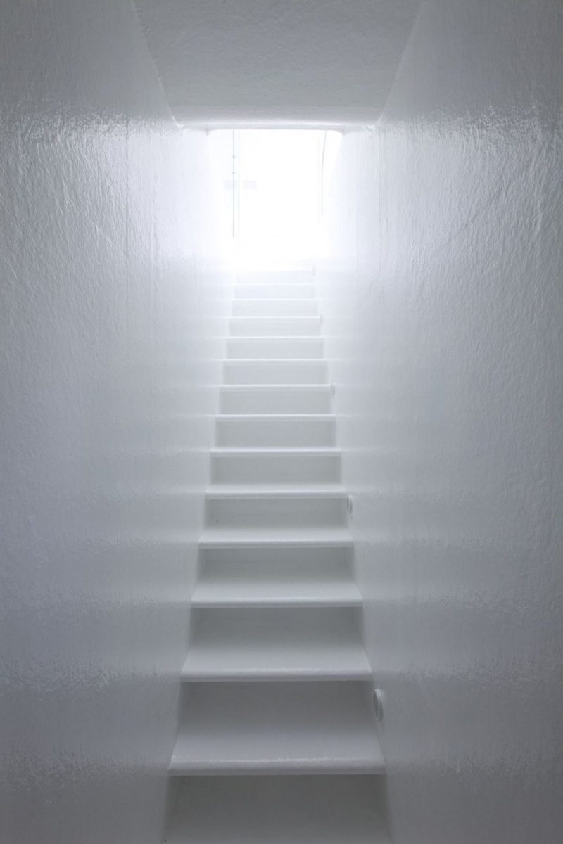 Dado lo angosto que es este pasillo de escaleras, el blanco parece ser el único color adecuado que podría hacer que el espacio se sienta menos claustrofóbico. Al mismo tiempo, todo el blanco enfatiza la luz natural brillante que entra por la ventana en la parte superior de la escalera.