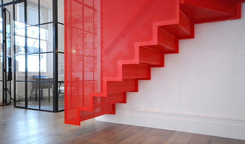 El color es en realidad lo menos interesante de estas escaleras. Esta es una escalera colgante que está completamente fuera del suelo.