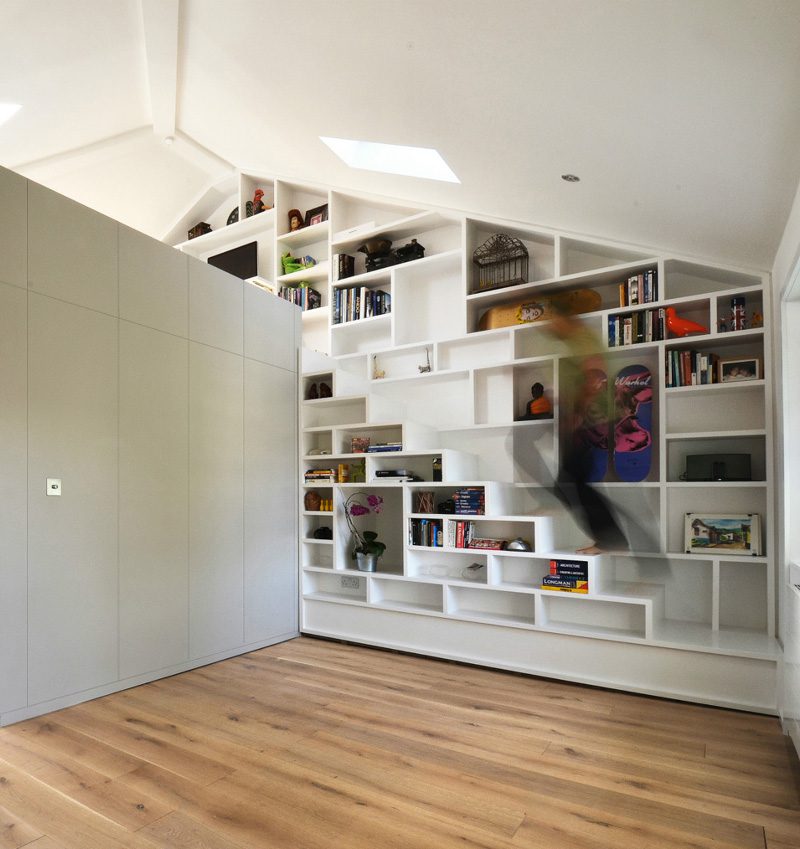 La combinación de escaleras y estanterías está muy bien equilibrada aquí. La estantería es una serie de compartimentos geométricos abiertos de diferentes formas y tamaños y las escaleras cuelgan y parecen flotar Luigi Rosselli Architects }.