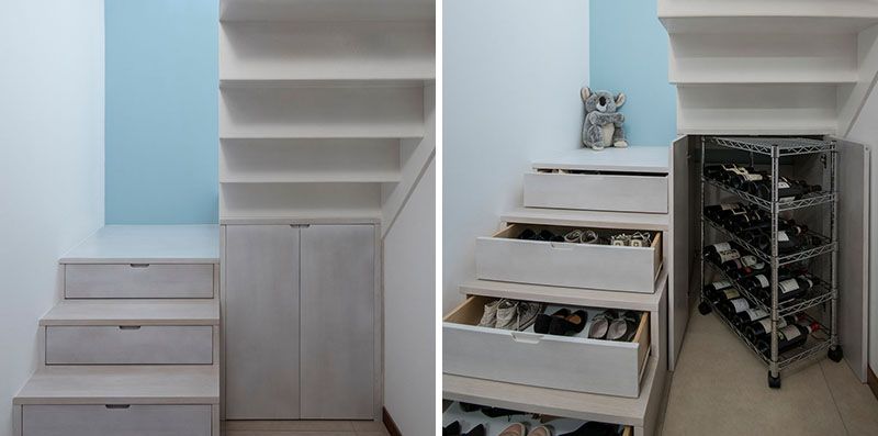 Las rendijas talladas revelan el hecho de que hay algo inusual en estas escaleras. No solo ofrecen almacenamiento para todos los zapatos, sino que también hay un botellero extraíble secreto allí. {Encontrado en Elia Barbieri }.