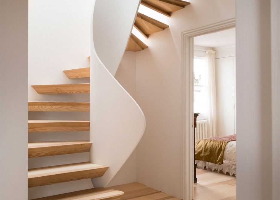Esta es una escalera que comienza como una espiral y luego se une a una escalera más estrecha con peldaños alternos. Ambos están hechos de madera y la transición entre ellos es realmente suave. {Encontrado en Coffey Architects }.