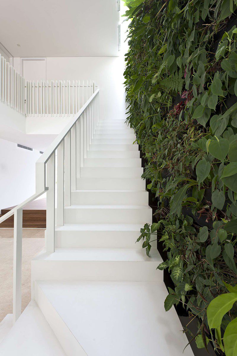 Aquí se muestra otro hermoso contraste donde una escalera blanca se complementa con una pared verde viva. Esa es toda la característica de acento para un espacio residencial.
