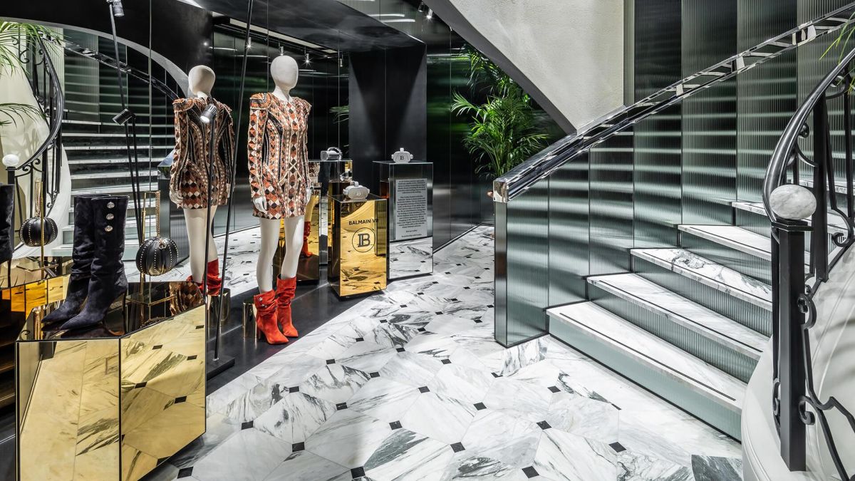 Una escalera de mármol puede agregar estilo y estilo a cualquier espacio y eso también se aplica a tiendas y oficinas. Este es el buque insignia de Balmain en París, diseñado por Studio AMV y, como puede ver, la escalera de vidrio y mármol encaja perfectamente en su decoración glamorosa.