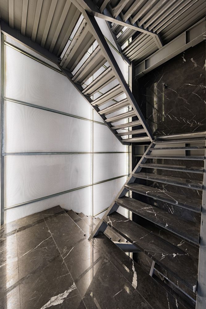 Aquí hay otro ejemplo de un conjunto de escaleras de mármol negro y una vez más se ven hermosas. La paleta de colores oscuros le da a esta escalera un ambiente sofisticado y moderno y el mármol asegura una apariencia atemporal. Este es un diseño creado por Studio Saheb para un edificio de apartamentos ubicado en Teherán.
