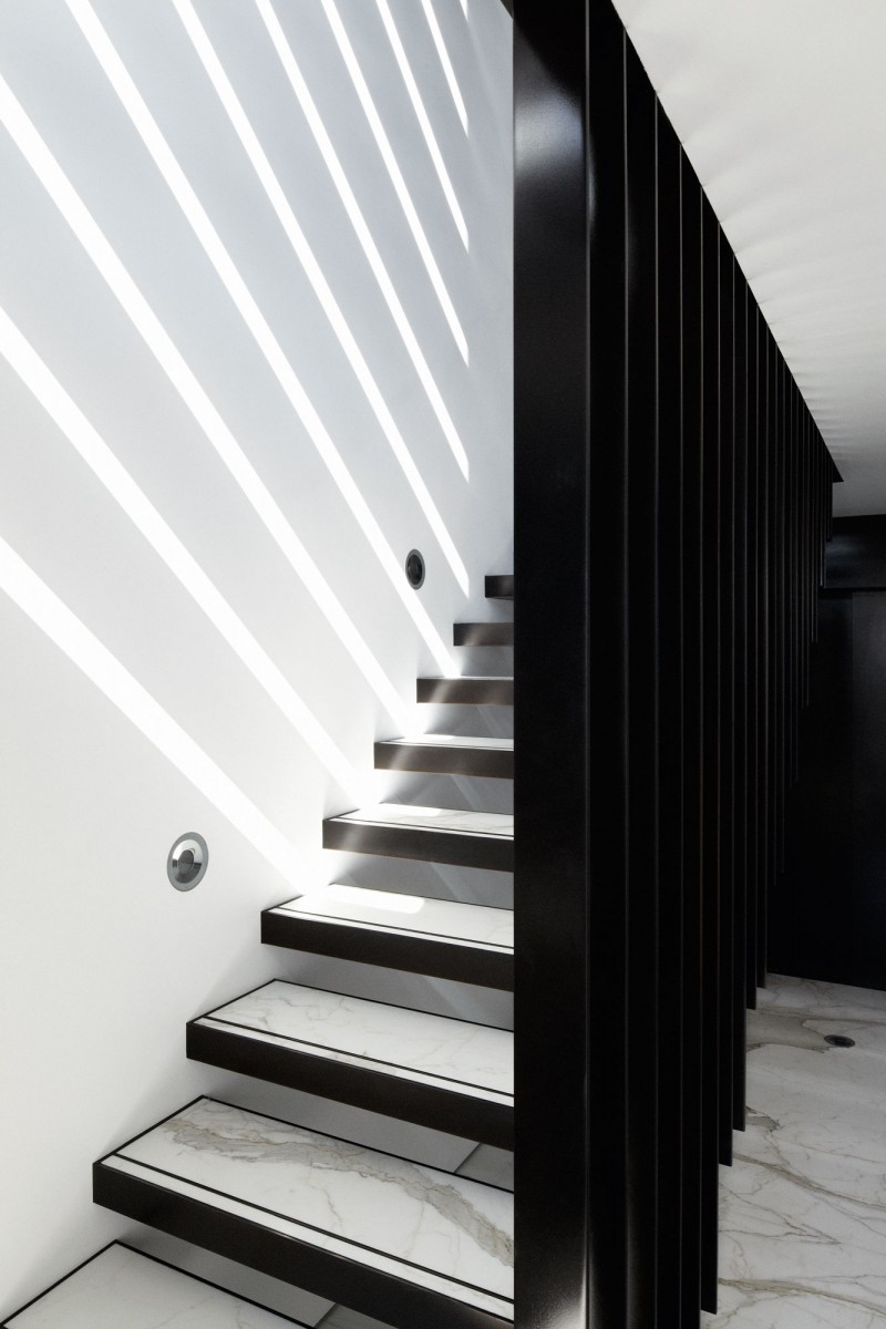 Ya mencionamos varias veces que el mármol es un material atemporal y en esa misma nota hay una combinación de colores particular que es igualmente versátil: el blanco y el negro. Cuando se combinan estos elementos, el resultado es absolutamente impresionante, como se puede ver en este diseño creado por Katon Redgen Mathieson . Las escaleras de mármol y los paneles negros verticales se complementan a la perfección.