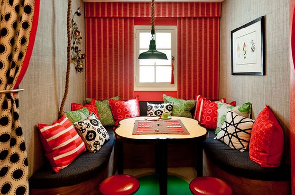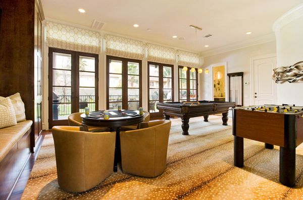 No necesariamente necesitas toda la habitación para divertirte con tus invitados. Puede crear un área de juego dedicada como parte de su sala de estar u oficina en casa. Una banqueta cómoda puede caber perfectamente en la esquina. Agregue una mesa simple y tendrá el lugar perfecto para jugar a las cartas o juegos de mesa.