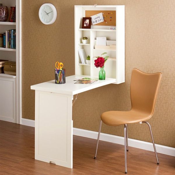 Un problema frecuente en las casas pequeñas es no tener suficiente espacio para un espacio de trabajo, por lo que o usas la mesa o la isla de la cocina como escritorio o sacrificas este espacio por otra cosa. Pero, ¿y si pudieras tener un escritorio que no ocupe más de unas pocas pulgadas de espacio cuando no se usa? Es el caso de este escritorio plegable que también tiene compartimentos de almacenamiento. {Encontrado en fancy }.