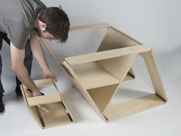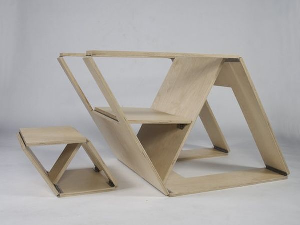 Los muebles plegables están llenos de sorpresas. Nunca sabes en qué se puede transformar hasta que realmente lo haces y, a veces, puedes llevarte una gran sorpresa. Por ejemplo, estas dos hojas planas de madera pueden convertirse fácilmente en una silla y una otomana/escabel. Quién diría que puedes tener muebles tan cómodos escondidos detrás de un diseño tan misterioso. {Encontrado en el sitio }.