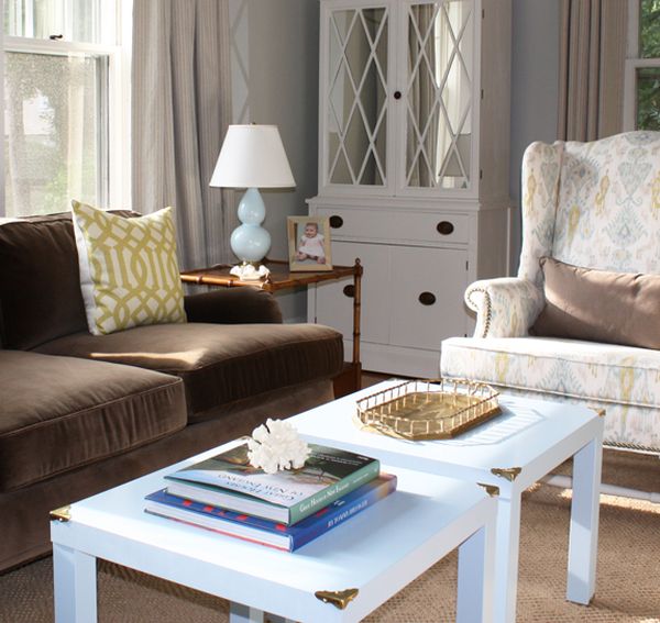 Por otro lado, si quieres algo realmente simple y fácil de hacer, prueba este proyecto. Necesitas un par de mesas auxiliares Lack y 16 esquineros de latón. También puede hacer esto para una sola tabla. La idea general es golpear los elementos de latón en las esquinas exteriores de las mesas. Esto incluye la parte superior y las piernas. {Encontrado en littlegreennotebook }.
