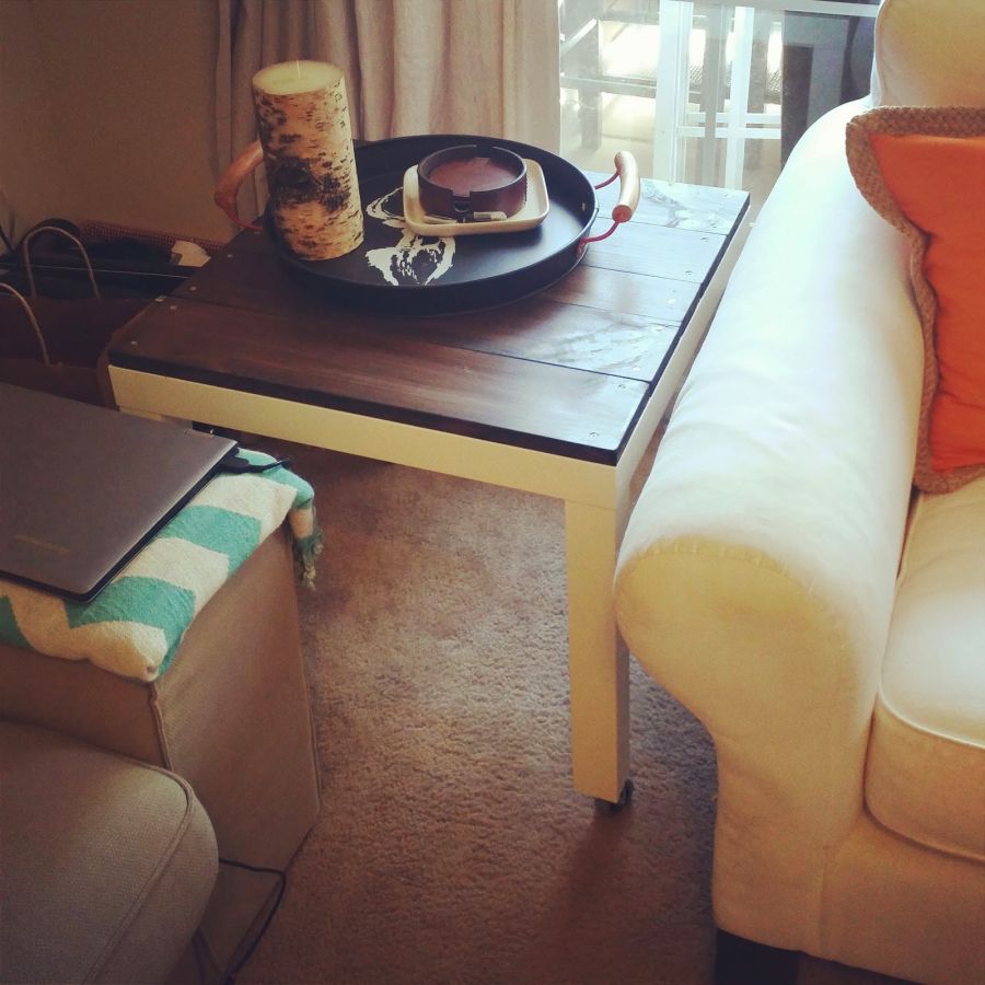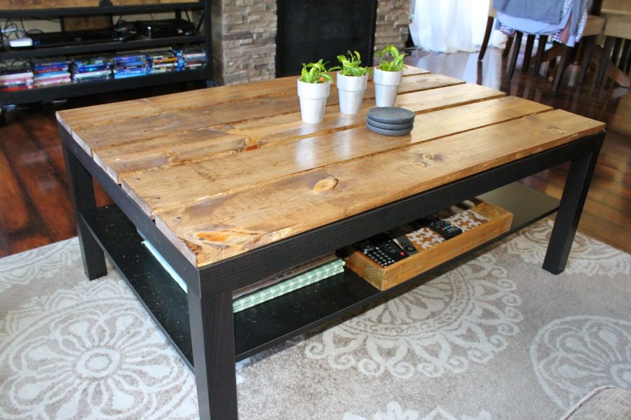 Los pasos para crear algo como esto son bastante simples. Primero, consigue una mesa de centro Lack Ikea y móntala. Luego consigue un poco de madera y corta las tablas a medida. Tiñelos con tu color favorito. Mida con cuidado las tablas y colóquelas encima de la mesa para que se asienten uniformemente. Puedes dejar algunos espacios entre ellos si te gusta el aspecto. Luego clava las tablas y eso es todo. {Encontrado en weekenderwife }.