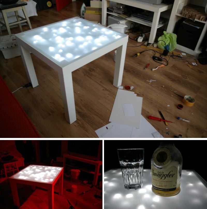 Y si quieres algo aún más elegante, echa un vistazo a esta elegante mesa con una parte superior que se ilumina. Para este proyecto necesitas una mesa Lack, una lámina de vidrio esmerilado cortado a medida, luces navideñas LED, cinta de espuma de doble cara, cable eléctrico y algunos enchufes e interruptores. Corta la mesa con un cortapapeles e inserta el cable, las luces y todo lo demás. Luego conecte los cables, pruebe todo y pegue con cinta adhesiva los cables. Luego, coloque cinta de espuma sobre el vidrio y péguelo a la mesa. {Encontrado en instructables }.