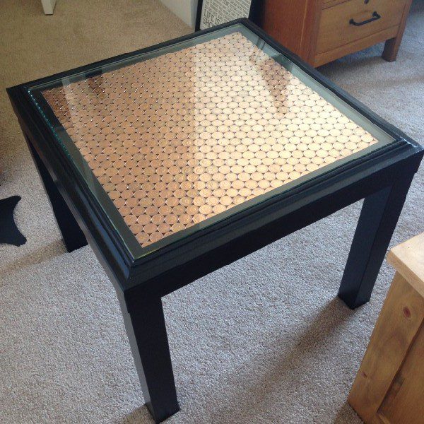 Pero basta de mesas de café. También echemos un vistazo a algunos proyectos relacionados con la mesa auxiliar Lack. Una idea muy interesante es cubrir la parte superior de la mesa con centavos. Para el proyecto necesitas molduras de madera, pintura negra, un soporte para marco de fotos, vidrio reforzado y alrededor de 621 centavos . No es un proyecto rápido, pero si tienes tiempo y paciencia, hazlo. {Encontrado en ikeahackers }.