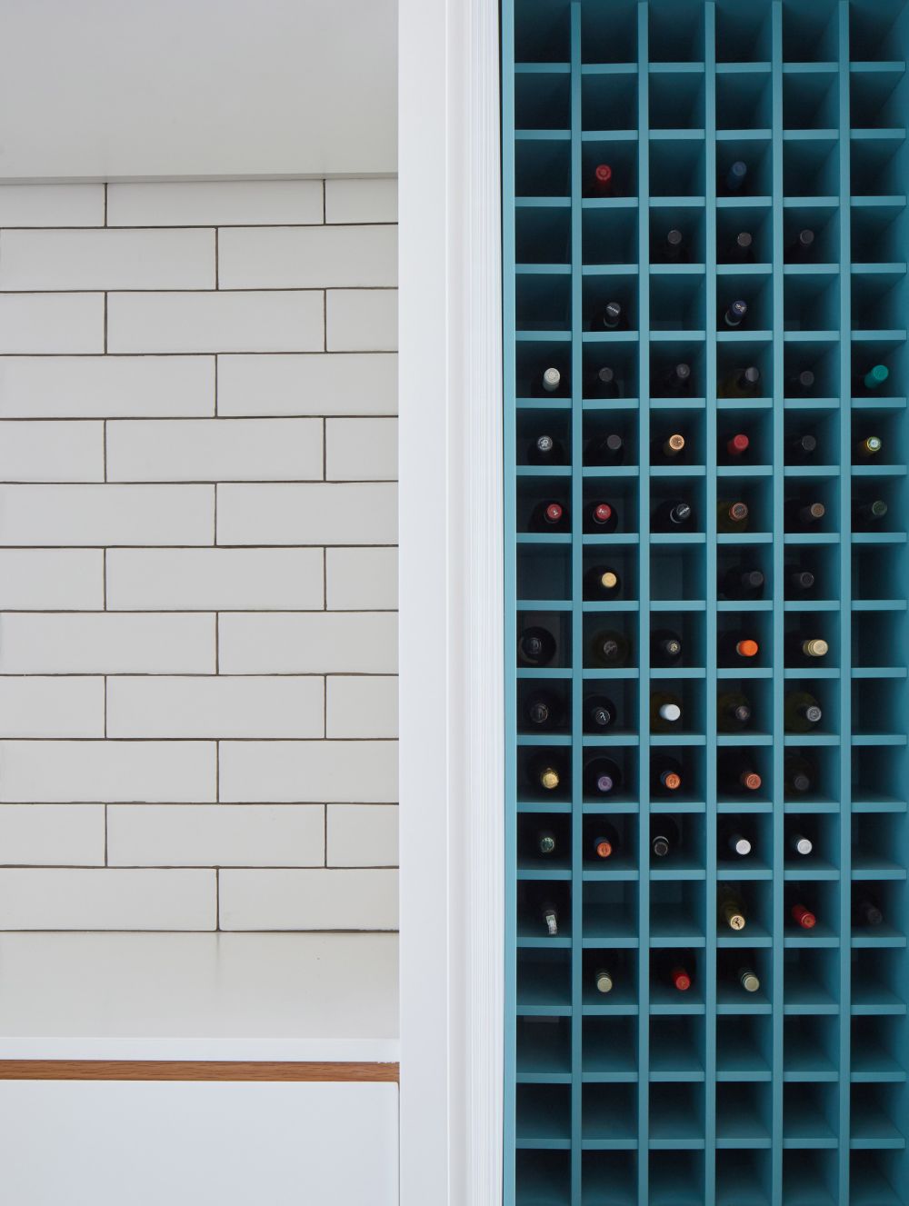 El arquitecto Matt Nardella de Moss convirtió una tienda de esquina abandonada en Chicago en una hermosa casa y estudio, y parte del diseño de la sala de estar de espacio abierto fue este sistema de botellero personalizado que también incorpora un almacenamiento adicional en forma de estantes abiertos y compartimentos con puertas cerradas. . Es similar a un sistema de clavijas de madera pero con un diseño más nítido.