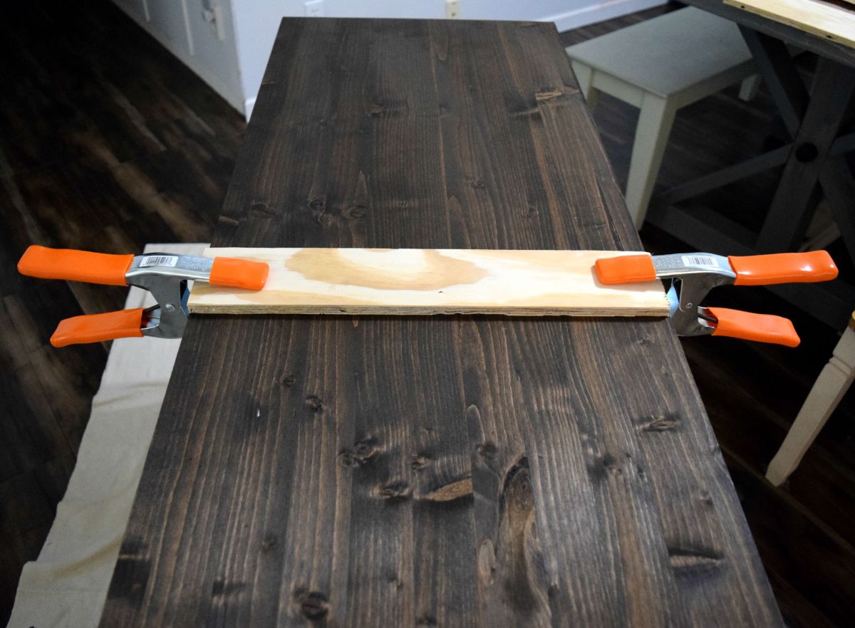 A continuación, coloque algunos trozos de madera sobrantes sobre la tabla de pino y sujete todo junto. Esto ayuda a proteger la tabla manchada contra daños causados por las abrazaderas. Deje reposar durante la noche.