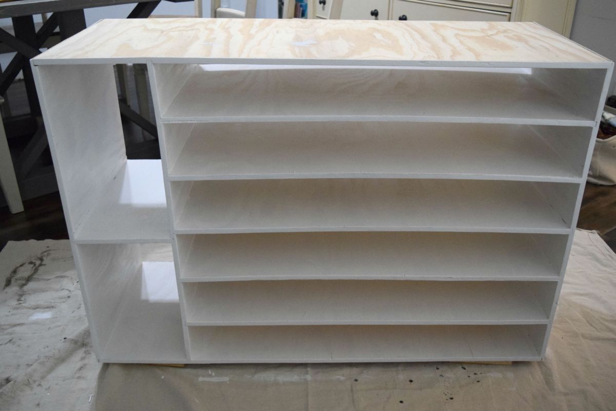 Asegúrese de que el gabinete de almacenamiento de zapatos de bricolaje y el pegamento estén completamente secos. Puede verificar esto retorciéndolo y agitándolo ligeramente para ver si todo permanece en su lugar. Si siente que los bordes de la madera contrachapada no son suaves, puede lijarlos. Una vez que lo quites del camino, puedes comenzar a pintar.