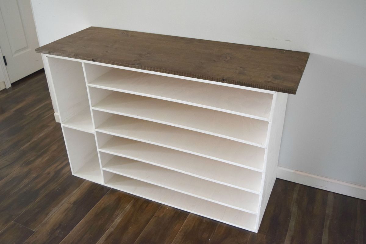 Corta la pieza de madera de pino a la medida y tíñela. Después de eso, puedes pintar el resto del zapatero en el color que elijas. Es probable que no necesite más que una capa de tinte para madera.