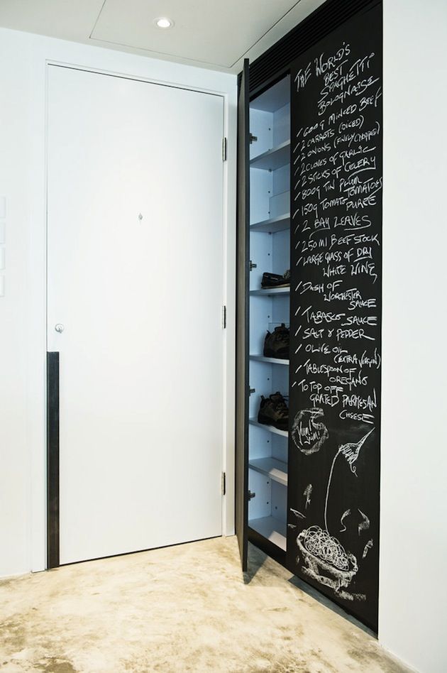 Podría ser una pizarra o borrado en seco, haga que el exterior de su zapatero quede un poco más oculto al hacer que esa parte de la pieza también sea funcional. Una pizarra gigante puede servir como su tablero de notas y las puertas a sus necesidades organizativas.