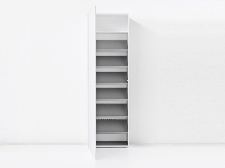 El mueble zapatero Blio diseñado por Neuland Industriaedesign es perfecto para recibidores pequeños. Almacena tus zapatos verticalmente en estantes inclinados, lo que facilita la identificación y el agarre del par que quieres usar. {Encontrado en Kristalia }.
