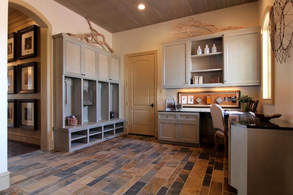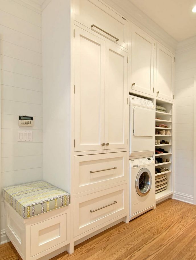 Este vestíbulo y área de lavandería es el lugar perfecto para quitarse los zapatos después de un largo día en el jardín o en el trabajo. Y esos estantes para zapatos son la manera perfecta de mantenerse limpio y ordenado.