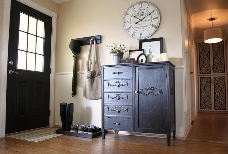 Esta puerta trasera está bien diseñada y se utiliza en un vestíbulo y en una oficina doméstica rápida. Observe los estantes inferiores, donde la familia y los invitados pueden deslizar sus zapatos mientras están dentro de la casa. Es una forma clásica y elegante de organizar.