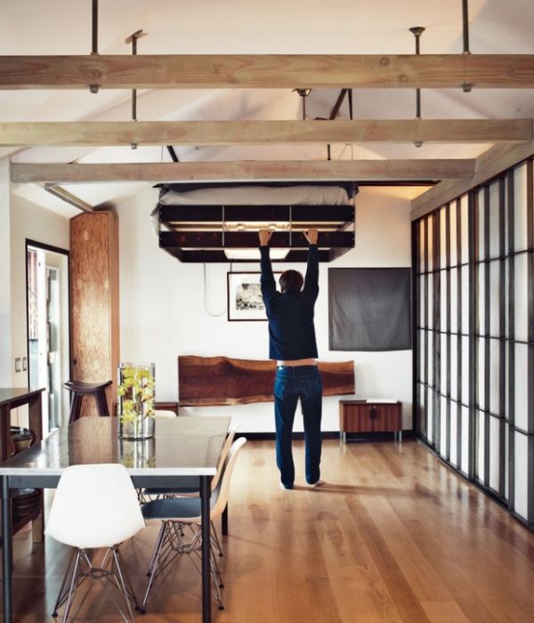 También hay otras formas de ocultar una cama. Por ejemplo, en lugar de deslizarlo debajo de una plataforma, puede levantarlo y ocultarlo sobre el piso, suspendido del techo . Parece un sistema práctico, pero todavía estaría nervioso cuando me sentara debajo de esa cama pesada.