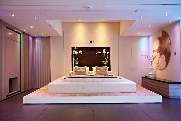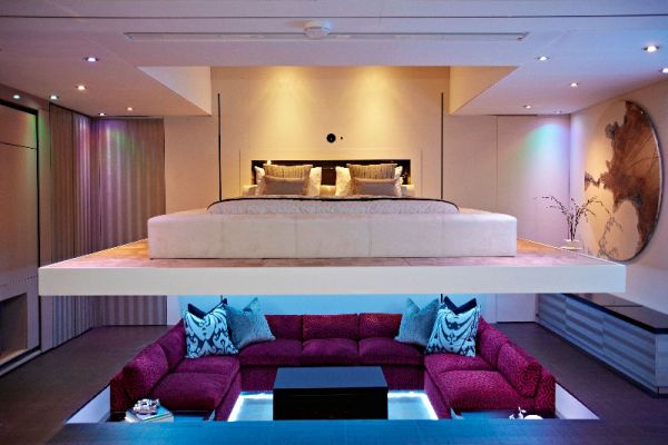 Ya hemos visto salones en los que la cama estaba escondida debajo de la zona de estar, pero ¿qué pasa con la situación contraria? Aquí tenemos todo un salón escondido debajo de la cama . La cama se asienta sobre una plataforma que se puede levantar y revela una zona de estar hundida con sofás y una mesa de café.
