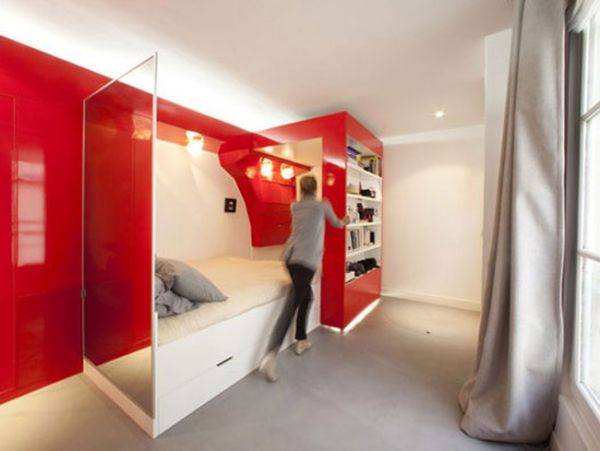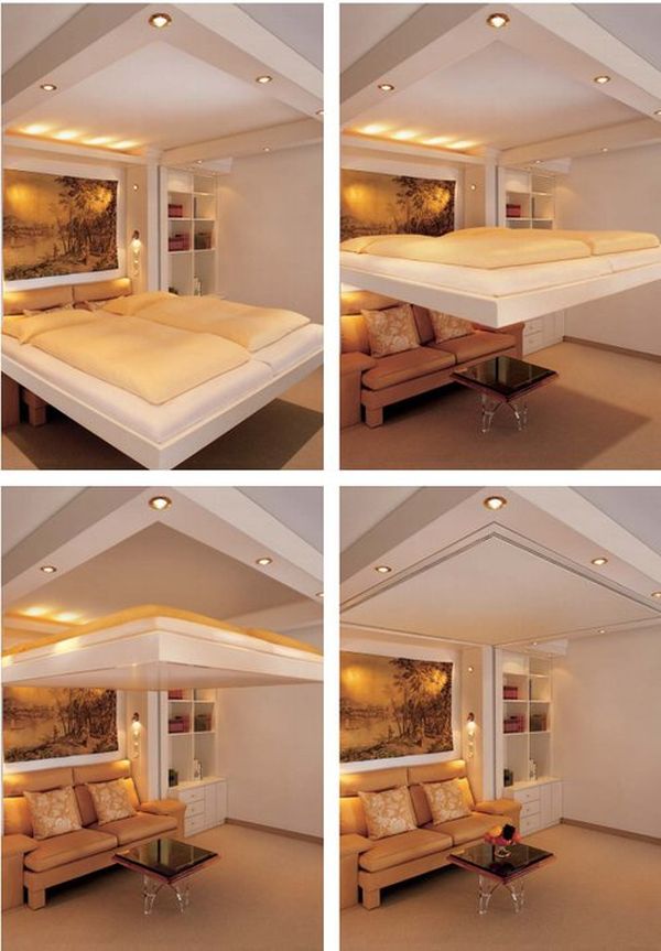 Este es un diseño en algún lugar entre los dos últimos que te acabamos de presentar. Básicamente, la cama se asienta en el aire cuando se usa y debajo está el área de asientos que permanece sin cambios independientemente de dónde se coloque la cama. Luego, cuando ya no se necesita la cama, desaparece en el techo. {Encontrado en treehuger }.