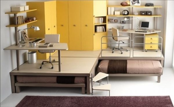 Aquí hay otro diseño interior muy práctico y que ahorra espacio. Esta vez tenemos dos camas, cada una escondida debajo de una estación de trabajo separada. Es una idea que puedes implementar para la habitación de los niños si tienen que compartirla.