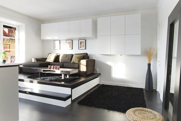 En el caso de este pequeño apartamento, tener una sala de estar con un sofá y luego un área para dormir con una cama grande en la misma habitación habría resultado en un espacio muy desordenado. Como resultado, a los arquitectos responsables del diseño de interiores se les ocurrió la idea de tener una cama que se enrolle debajo de una sala de estar elevada.