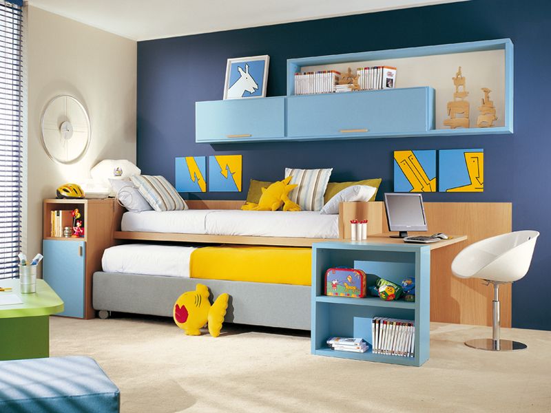 Las camas nido también son perfectas para espacios que sirven para múltiples propósitos, como este dormitorio/oficina/sala de juegos, por ejemplo. Cuando se amplía la cama, es posible que dos o incluso tres personas duerman aquí.