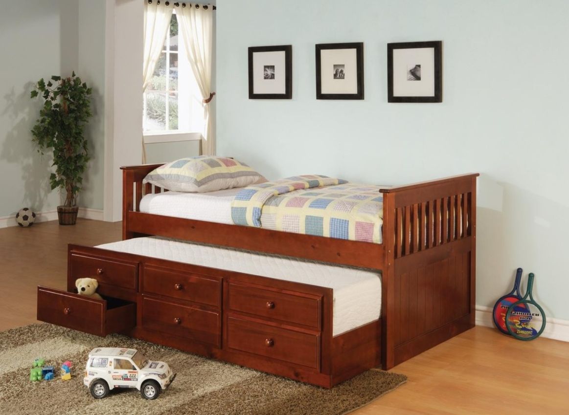 2. Una cama nido es una cama baja con ruedas que rueda debajo de la cama principal, ya sea una cama de día o una cama estándar.