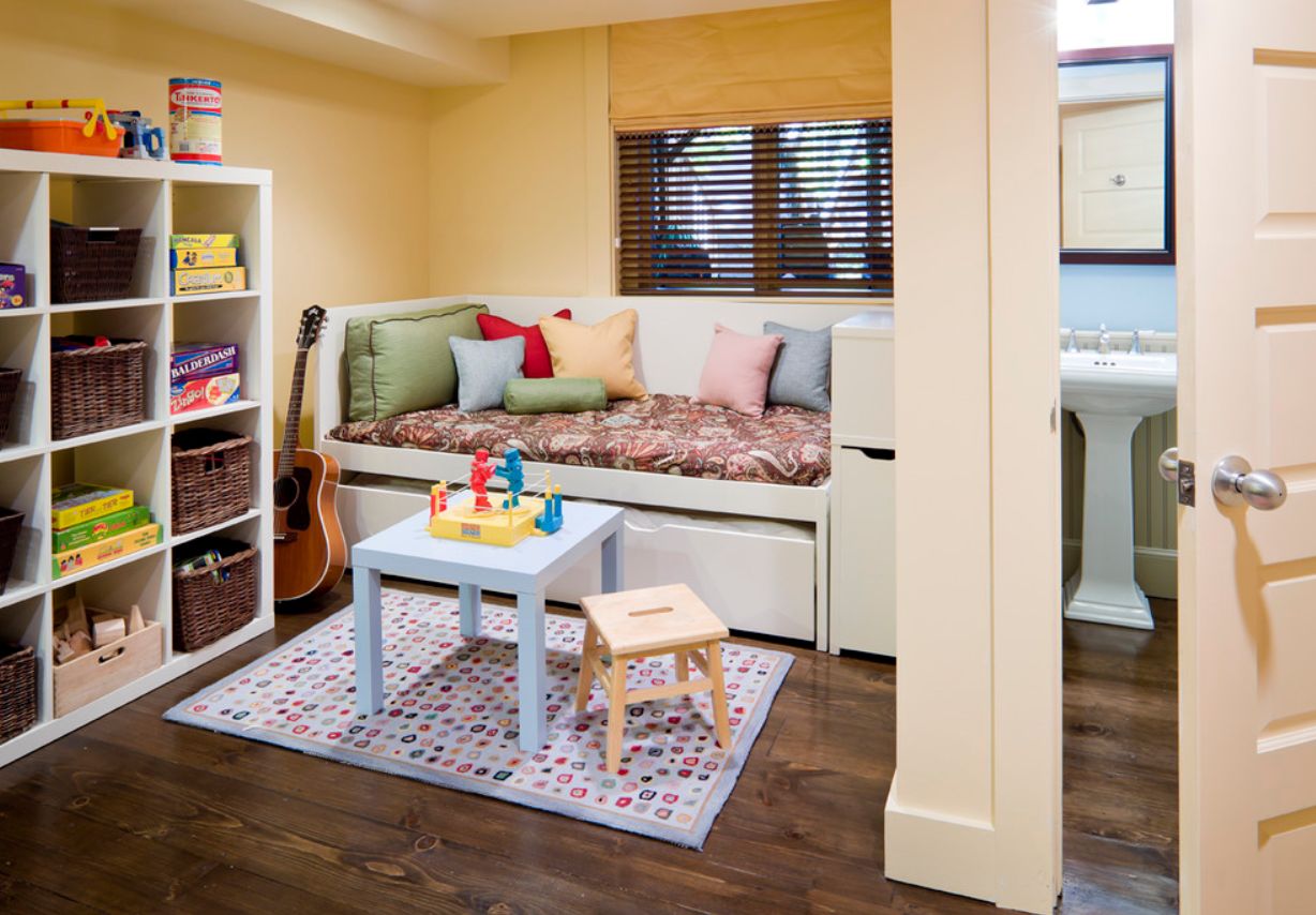 Esto es especialmente cierto para apartamentos tipo estudio , muchas habitaciones para niños, cuartos de guardería y algunos áticos. El interior de esta hermosa sala familiar de la casa del lago diseñada por Bergland + Cram es un buen ejemplo.