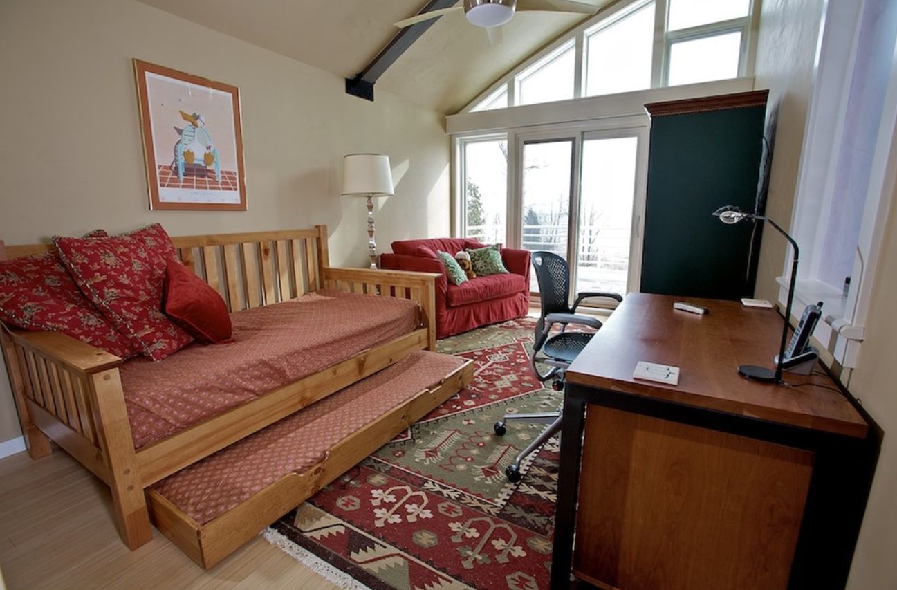 También es una maravillosa opción para una habitación de invitados. El espacio puede servir como oficina en casa o como salón secundario la mayor parte del tiempo. Además, puede y puede convertirlo en un área de descanso para invitados cuando lo necesite.