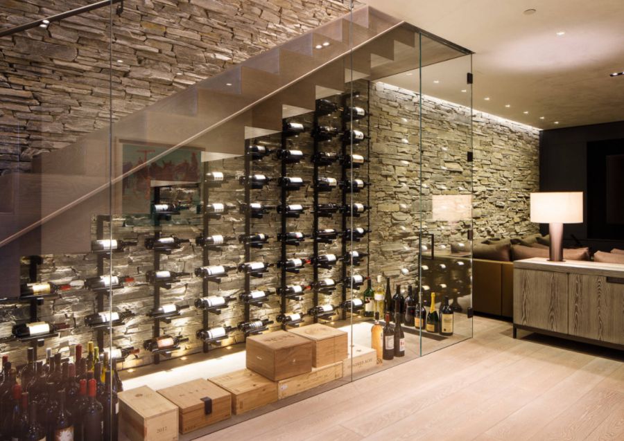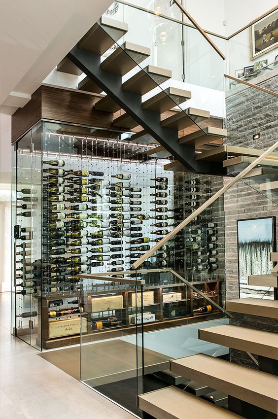El diseño de la bodega depende del tipo de escalera. Una larga escalera flotante como esta deja mucho espacio debajo para un sótano grande y espacioso. Todo está encerrado en vidrio que expone la pared detrás de los estantes y la escalera misma.