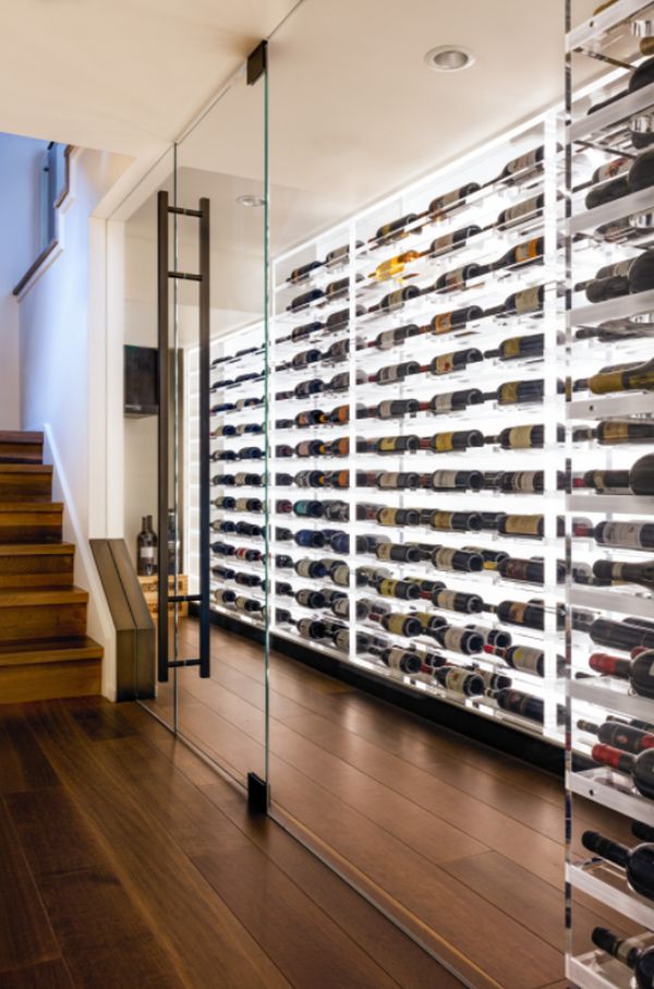 Pon énfasis en la bodega con un diseño brillante y transparente. Las paredes y puertas de vidrio de altura completa y los estantes abiertos con retroiluminación pueden brindarle el efecto deseado. Este diseño en particular fue realizado por el estudio Architectural Plastics .