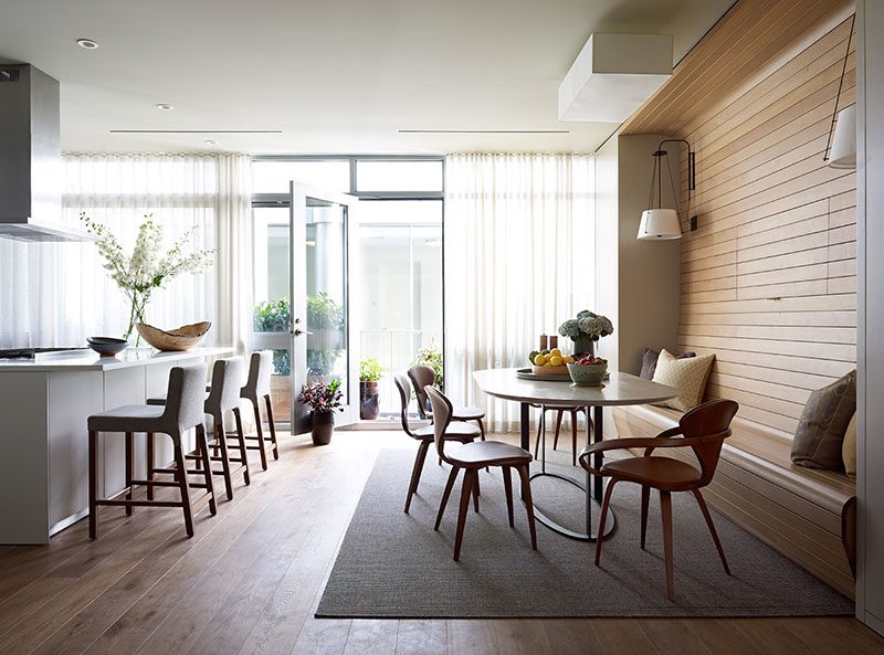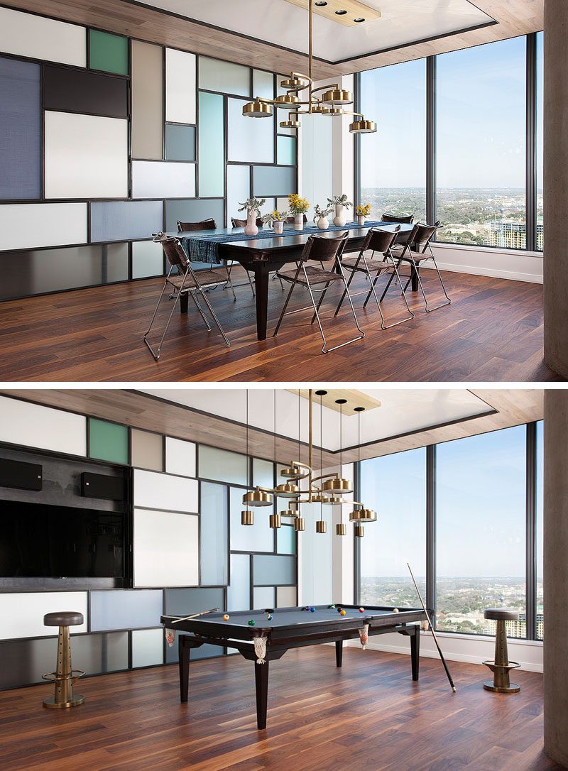 El apartamento diseñado por Sanders Architecture y Cravotta Interiors tiene una mesa de comedor que se convierte en mesa de billar y eso está muy bien pero, aun así, no es el único elemento impresionante de esta habitación. echa un vistazo a esa llamativa pared decorativa con paneles geométricos de varias formas, tamaños y colores. Una sección se abre y revela un televisor montado en la pared .