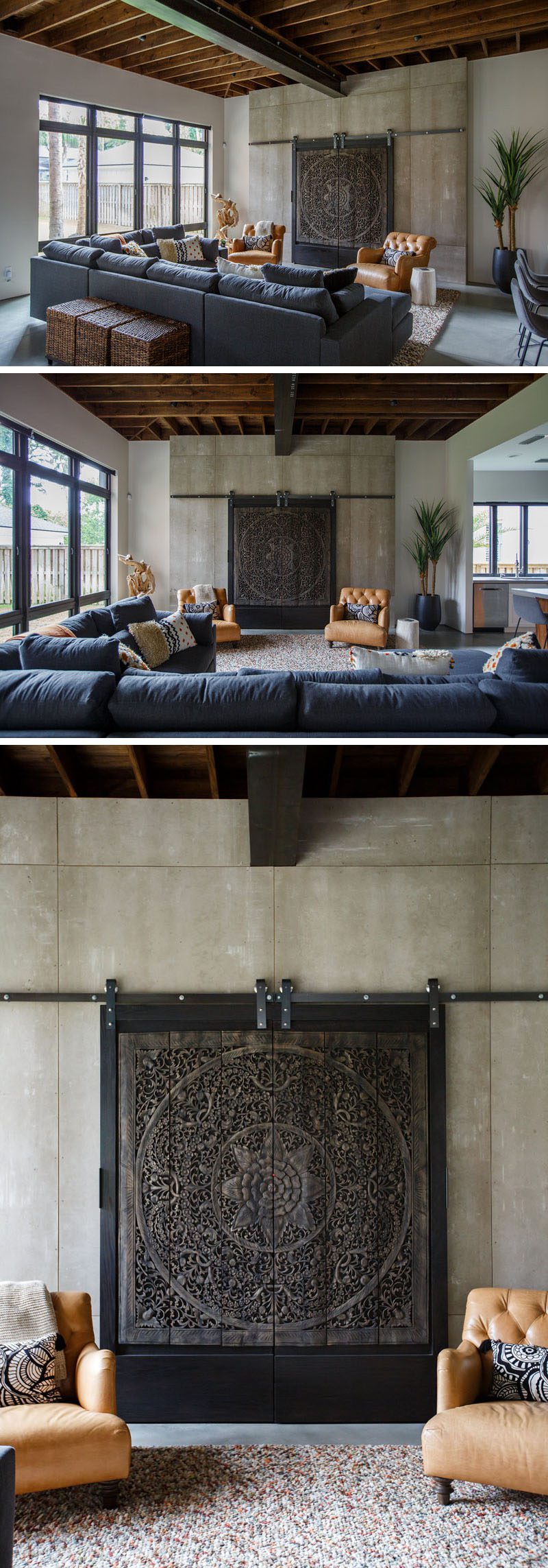 En lugar de tratar de ocultar perfectamente el televisor dentro de una unidad de pared o detrás de las puertas de los gabinetes, dig Architecture eligió una estrategia diferente. Echa un vistazo a esta casa moderna de Atlantic Beach, Florida. Tiene un precioso interior salpicado de elementos industriales. En la sala de estar, el televisor colgado en la pared está escondido detrás de paneles de madera tallada instalados en una guía de metal.