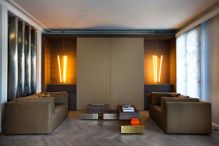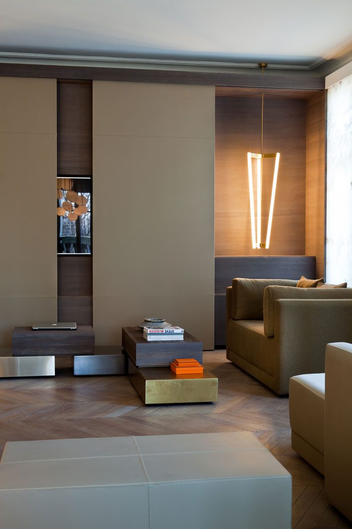 Esta es la sala de estar de un apartamento situado en París, Francia, que cuenta con impresionantes vistas de la Torre Eiffel y el Sena. Es un espacio diseñado por SO-AN que aprovecha al máximo los paneles correderos y pivotantes. Esta habitación en particular cuenta con particiones deslizantes que ocultan el televisor. Cuando se abren, se revela el televisor y se ocultan las lámparas de ambos lados.