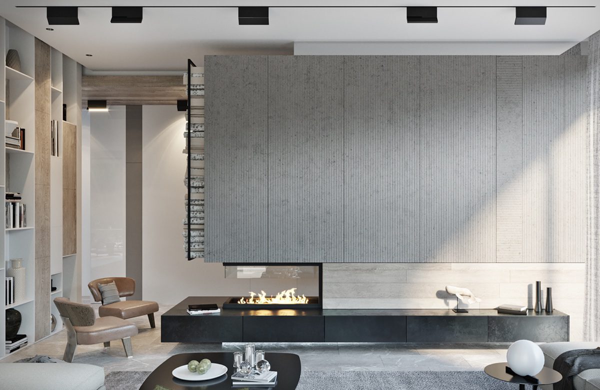 La residencia diseñada por MOPS Architecture Studio en Moscú, Rusia, tiene este elegante separador de pared con una chimenea abierta incorporada que se puede disfrutar desde cualquier lado y un juego de puertas que hábilmente ocultan un televisor incorporado. El roble antiguo se ve exquisito, especialmente en combinación con el mármol del suelo.