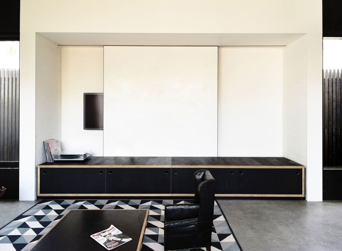 Wolveridge Architects eligió una estrategia diferente cuando diseñaron la Residencia Northcote. El televisor de la sala está colgado en la pared y un panel deslizante puede moverse de lado a lado para ocultarlo o mostrarlo, según la actividad que los habitantes quieran disfrutar. La casa está ubicada en Melbourne, Australia.