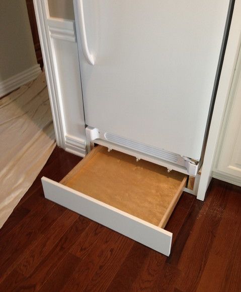¿Conoces esa pequeña porción en la parte inferior del gabinete, justo debajo de los cajones? Tiene el mismo color que el resto del mueble y parece un cajón pero normalmente es solo una pieza de madera. Esto lo hace perfecto para esconder cosas en el interior. Podría convertirlo en un cajón secreto y todos los demás pensarían que es simplemente madera, especialmente si está directamente debajo de los cajones normales. {Encontrado en el sitio }.
