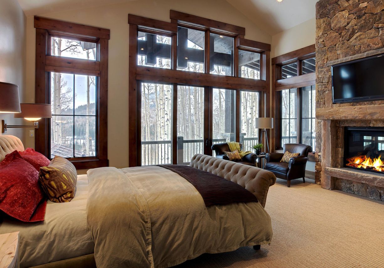 La cama trineo queda genial en este dormitorio rústico. Jaffa Group Design Build también le dio al espacio una acogedora chimenea con un marco de piedra y alfombras de color marrón claro que crean un ambiente cálido y acogedor y una decoración que es una mezcla de lo tradicional, lo rústico y lo moderno.