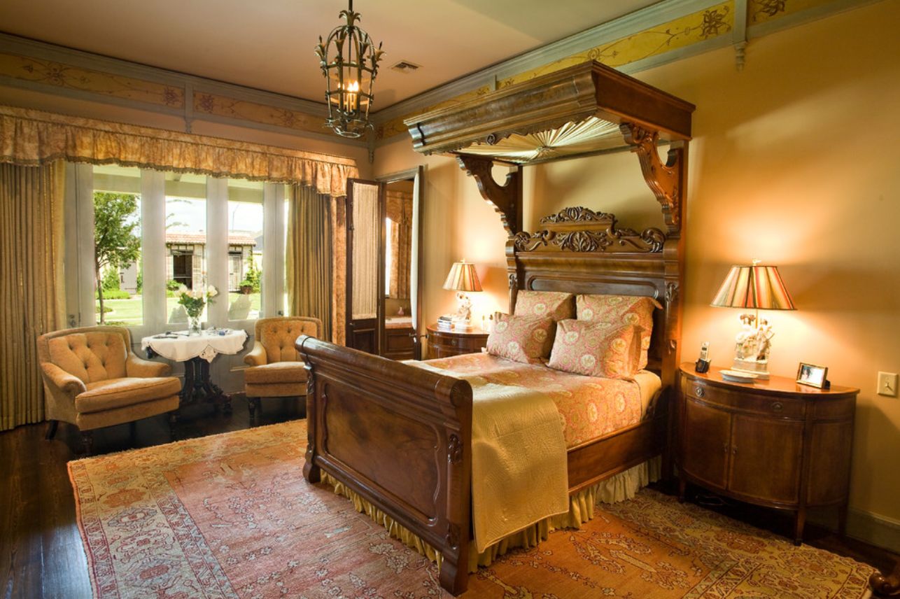 Una cama trineo también suele tener un aspecto delicado y femenino a pesar de su estructura robusta y pesada. Eso lo convierte en un buen candidato para el dormitorio principal o para las habitaciones de invitados. Se trata de un espacio diseñado por Domiteaux Architecture que cuenta con una decoración de estilo tradicional. No es solo la cama la que tiene curvas sino también el tocador, las lámparas, los sillones e incluso las paredes.