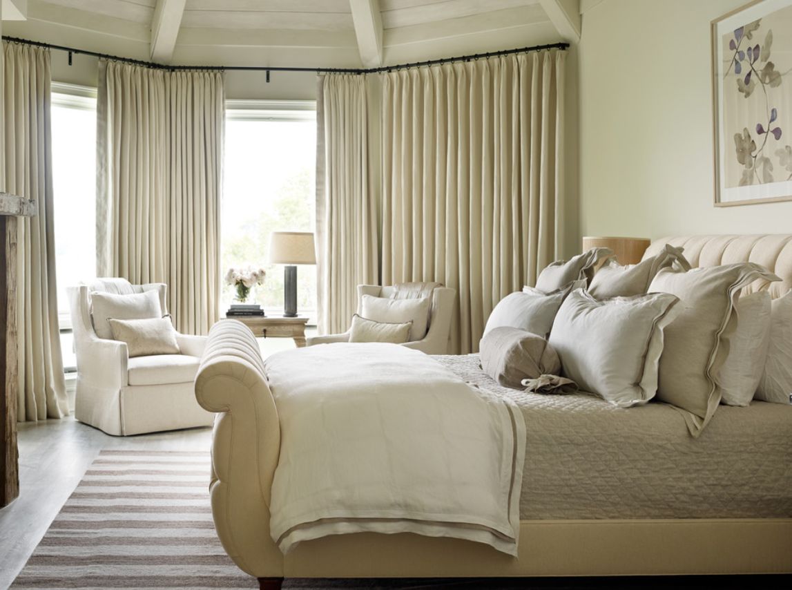 Es posible que una cama trineo tenga un marco tapizado, como se muestra en este elegante interior de dormitorio de J Visser Design . El tejido suaviza las curvas de la montura y realza