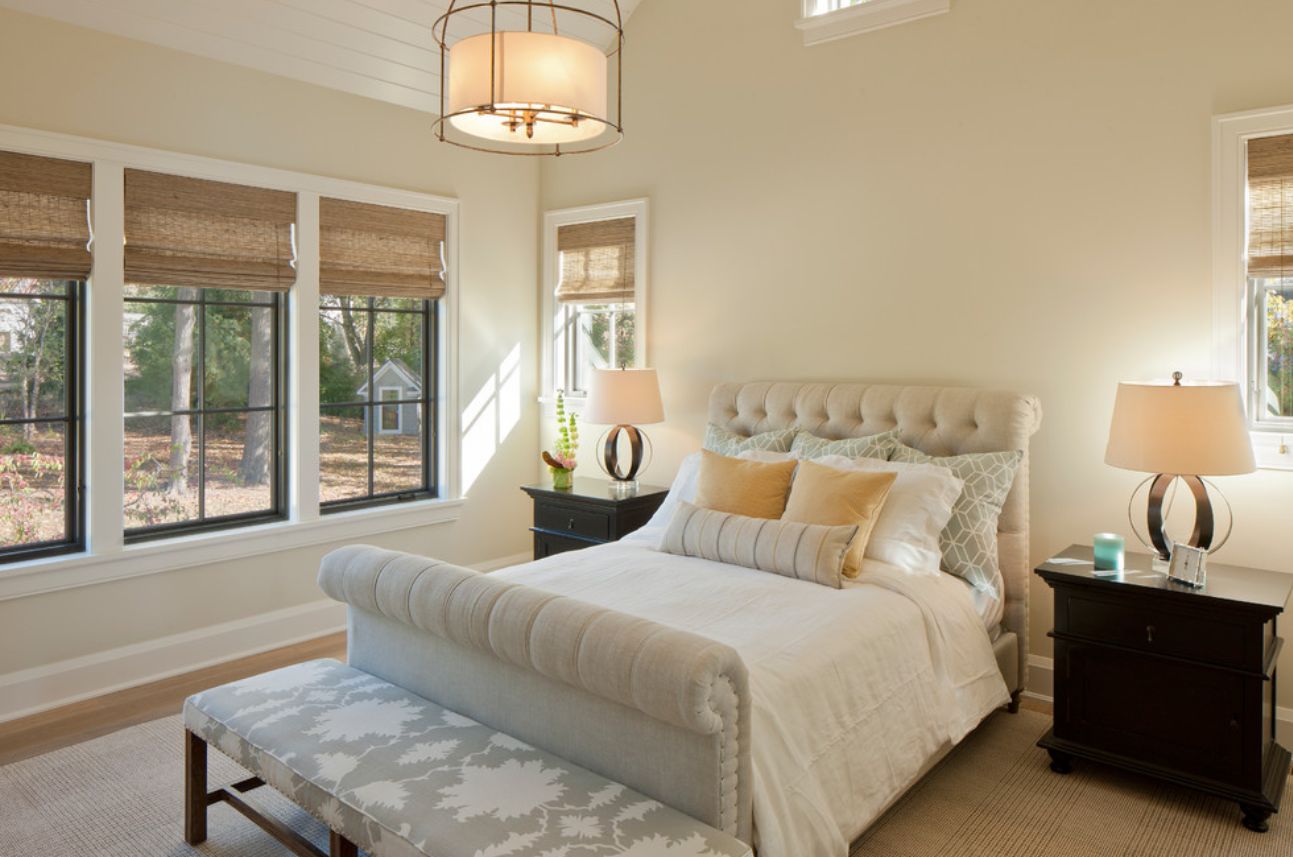 Algunos diseños parecen ser una especie de híbridos, combinaciones de elementos de dos o más estilos. Por ejemplo, este dormitorio de Anderson Homes presenta un tipo de cama tipo trineo con esta estructura inusual similar a un dosel unida a su cabecera.