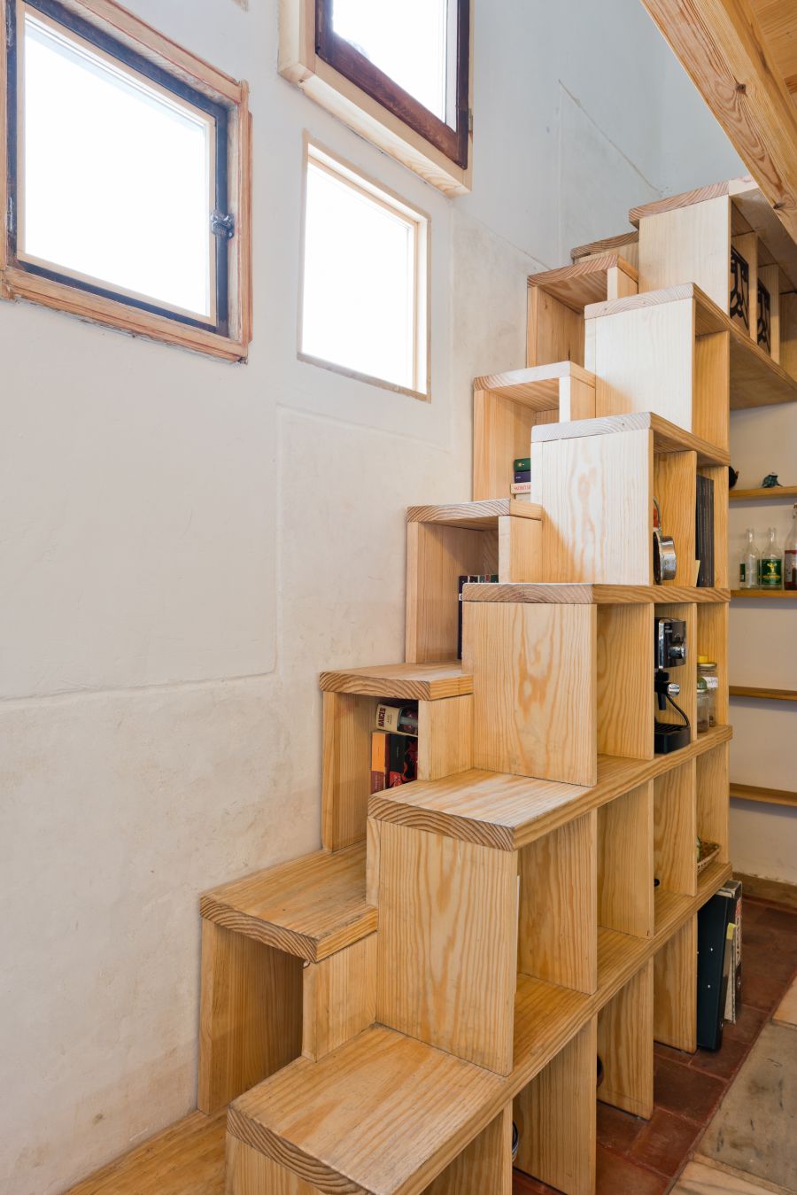 Las escaleras que ahorran espacio en general se definen por su capacidad de duplicarse como otra cosa o de combinar dos o más funciones en un diseño único y versátil. Las escaleras alternas se pueden convertir en una práctica unidad de almacenamiento con compartimentos de almacenamiento abiertos en ambos lados. {Encontrado en Colectivo PEC }.