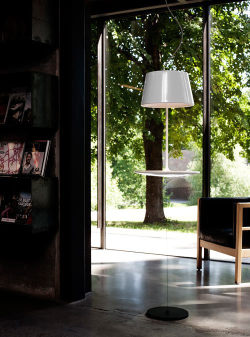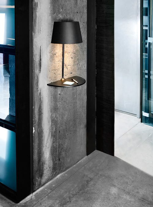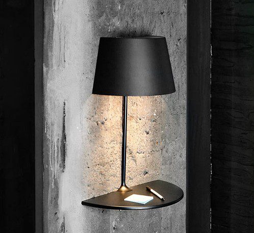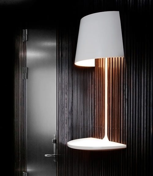 Ya que hemos mencionado los accesorios, echemos un vistazo a algunos. Vamos a empezar con esta lámpara de aspecto interesante. Se llama “Illusion”, al igual que la mesa que te mostramos arriba y fue diseñada por Hareide Design para Northern Lighting . Es una lámpara de pared que parece cortada por la mitad. Es una gran pieza llamativa y también viene como lámpara colgante.